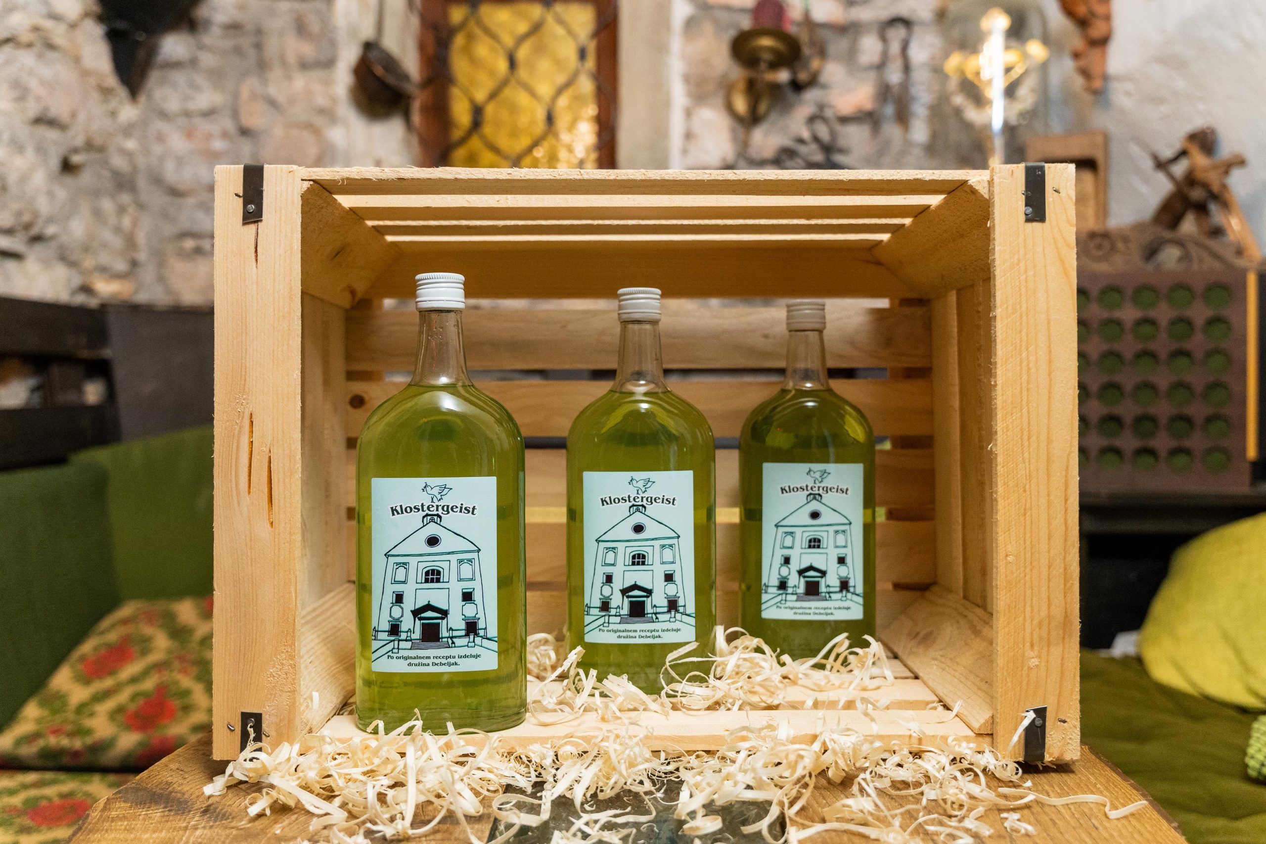 Klostergeist, ali po domače kloštrgajst, je nemški izraz, ki združuje besede kloster (slo. samostan) ter geist (slo. duh). In prav res lahko v njegovem značilnem vonju in okusu začutimo duh večstoletne tradicije. Je prepoznavno zelene barve, zaradi česar mu v lokalnem okolju pravimo tudi »ta zelen«. V njem se skriva preko 10 različnih zdravilnih zelišč, ki poskrbijo za polnost okusa, izbrana kombinacija pa tudi blagodejno vpliva na vaš želodec. Po izvirnem receptu nun uršulink gre za žgano pijačo, ki pa zaradi svoje zdravilne vloge, spada bolj v vrsto likerjev. Vsebuje vol.22% alkohola na 1l pijače.